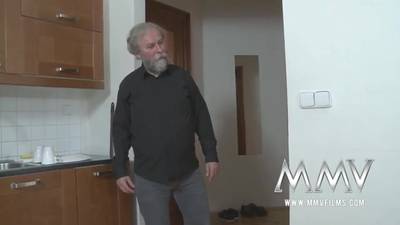 Una donna bruna va a casa, inizia a toccarsi e poi arriva un vecchio che la scopa per bene!