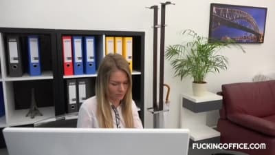 Questa bionda segretaria ha comprato un teppeto per l'ufficio. Un giovane molto eccitante lo consegna ed insieme decidono di provarlo scopandoci sopra!