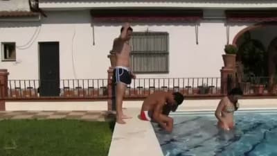 Tanto divertimento alla luce del sole per questa giovane mora che è circondata da cazzi eccitati in piscina!