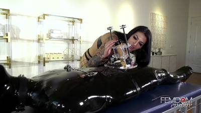 Questo sottomesso in tuta di lattice si farà applicare un dispositivo di mungitura del cazzo, si sdraierà e sarà distrutto dalla sua Padrona!