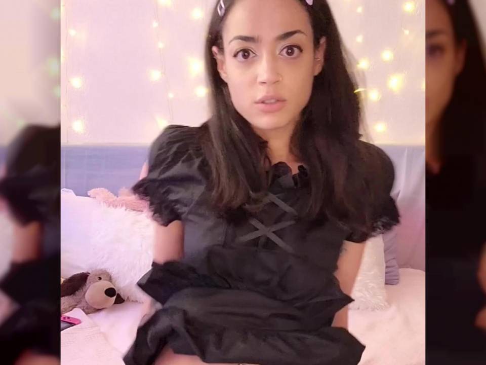Una bella ragazza mora alza il suo abitino per mostrarci la sua figa rasata e masturbarsi comodamente in webcam!
