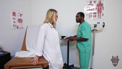 La sexy dottoressa Joslyn ha una cotta per il suo attraente infermiere nero e lo stuzzica finché lui non le infila il suo grosso cazzo nella figa.