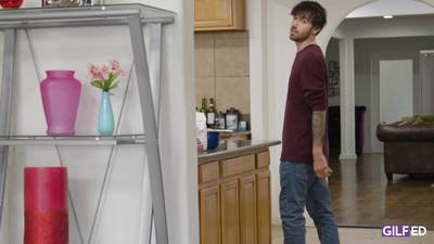 Questa nonna troia cucina e si masturba guardando un porno. Finisce per fare sesso a tre con una giovane coppia nella sua cucina.