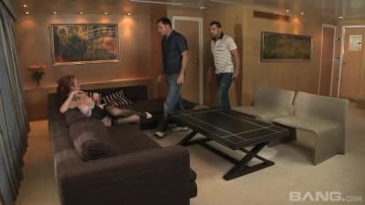 La troia rossa con le tette grosse Tarra indossa calze sexy e succhia questi cazzi e si fa scopare la bocca e il culo in questa gangbang!