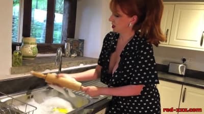 RedXXX è seduta sul bancone della cucina, indossa tacchi a spillo rossi e si masturba la sua figa matura, con il suo sex toy feticcio, un mattarello da cucina.
