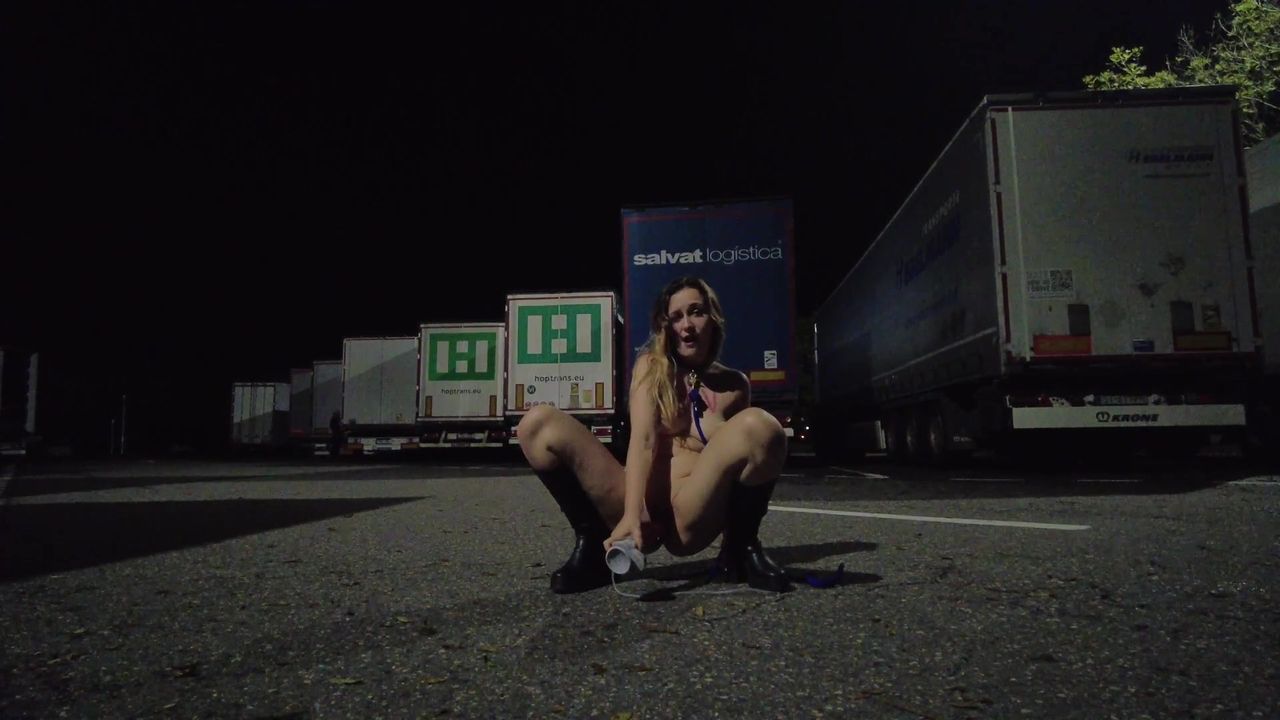La piccola troia francese vuole che tutti la vedano masturbarsi nel parcheggio dei camion. Allarga le gambe e usa il dildo per penetrarsi.