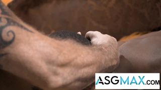 Questo nero alto e muscoloso è venuto per un tatuaggio, ma ha finito per sdraiarsi e farsi fare un pugno nel culo mentre succhiava il cazzo di un altro uomo.
