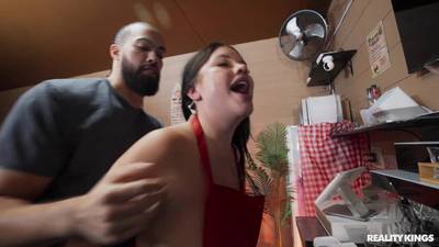 La sexy manager Madalina Moon flirta con il vlogger James Angel, mostrando le sue grandi tette sotto il grembiule, succhiandogli il cazzo e lasciandosi scopare in piedi.