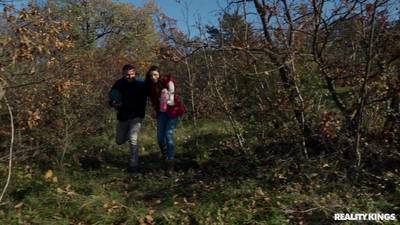 I turisti Candie Luciani e Juan Lucho chiedono a un'escursionista di filmarli mentre scopano nel bosco, sditalinando e sbattendo la sua figa contro un albero