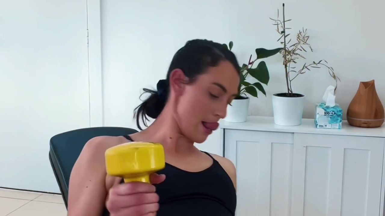 Iniziando a fare esercizi, si spoglia e si masturba con i giocattoli