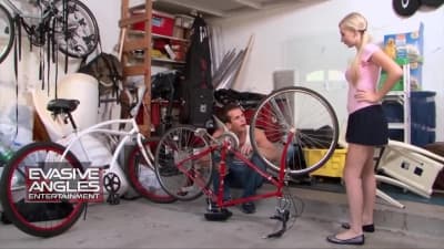 Biondina con dei bei seni viene scopata dal proprietario di un negozio di bici nella sua officina e lei avrà il suo sperma in bocca