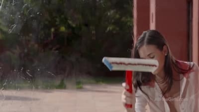 La bruna stava pulendo le finestre intorno alla piscina e, siccome fa caldo, si toglie i vestiti. Questo la rende molto eccitata e finisce per masturbarsi